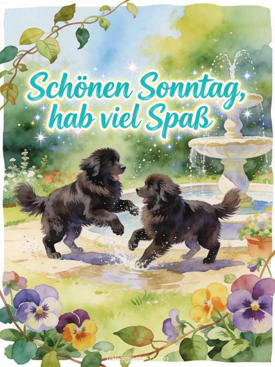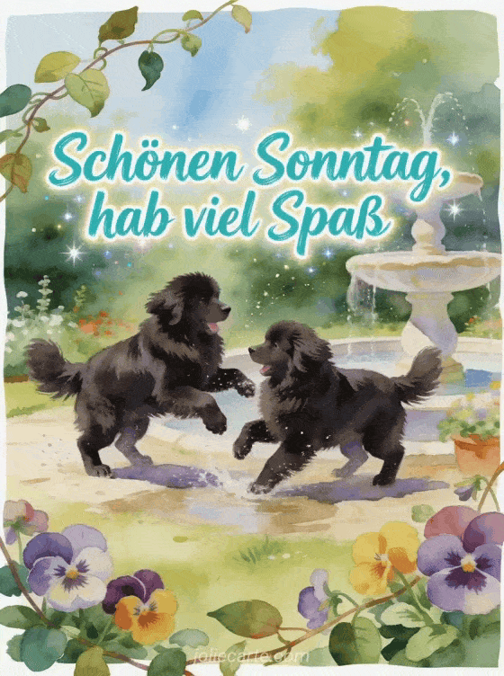 Sende schönen Sonntag, hab viel Spaß mit türkisfarbener Schrift, zwei Neufundländer Hunden, die neben einem Gartenbrunnen spielen, Stiefmütterchen und hängenden Blättern. Entdecke auch animierte virtuelle Schönen-Sonntag-Karte, Sonntag Küsse GIF oder Schönen Sonntag religiöses GIF.