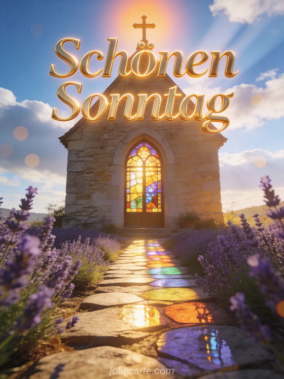 Teile einen leuchtenden Sonntagsgruß mit einer Landkapelle, goldenem Morgenlicht, bunten Buntglasreflexen, einem Steinweg und blühendem Lavendel. Du kannst auch Schönen Sonntag animiertes glitzerndes GIF oder Guten Morgen schönen Sonntag und schönen Tag senden.