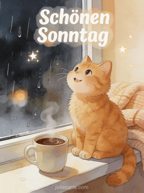 Teile einen schönen Sonntag mit einer verspielten roten Katze, einem warmen Getränk und einer gemütlichen Regenszene am Fenster. Entdecke auch eine kleine Schönen-Sonntag-Nachricht, ein Bild um einen schönen Sonntag zu wünschen oder schönen sonntag karten kostenlos.