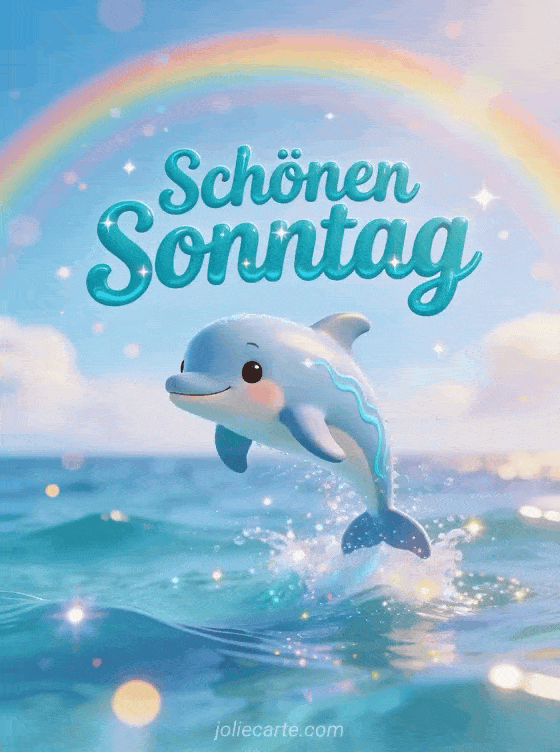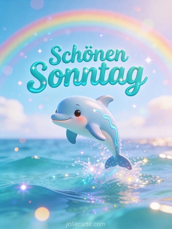 Teile einen verspielten Sonntagsgruß mit einem niedlichen Cartoon-Delfin, der aus funkelndem Ozeanwasser springt, einem Regenbogen und heller Sommerenergie. Du kannst auch schönen Sonntagmorgen oder Schönen Sonntag mein Schatz senden.