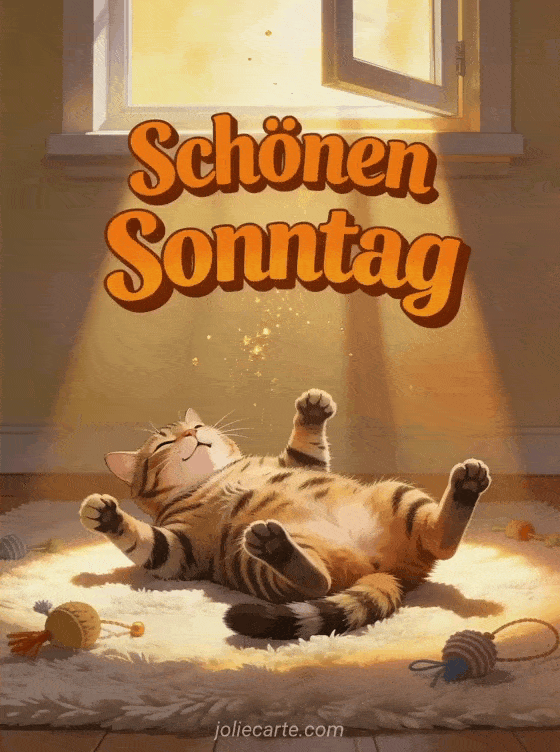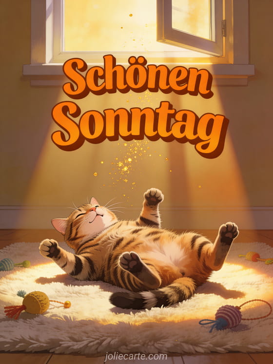 Teile einen lustigen Sonntagsgruß mit einer pummeligen Tigerkatze, die in einem goldenen Sonnenstrahl auf dem Rücken liegt, Pfoten in der Luft, Spielzeug ringsum und voller Glück. Du kannst auch Schönen Sonntag meine Freundin oder Schönen Sonntag gif Humor senden.