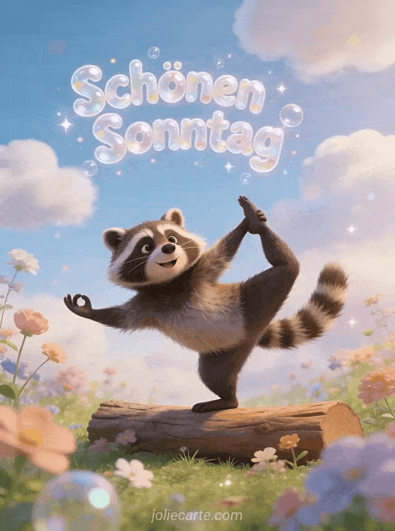 Senden Sie einen lustigen Gruß zum schönen Sonntag mit hüpfenden Bubble-Buchstaben und einem Waschbären, der auf einem Baumstamm Yoga-Posen in einer absurden Wellnessszene macht. Entdecken Sie auch einen schönen Sonntag wünschen, Schönen Sonntag im Juni oder schönen Sonntag Freundschaft Bilder.