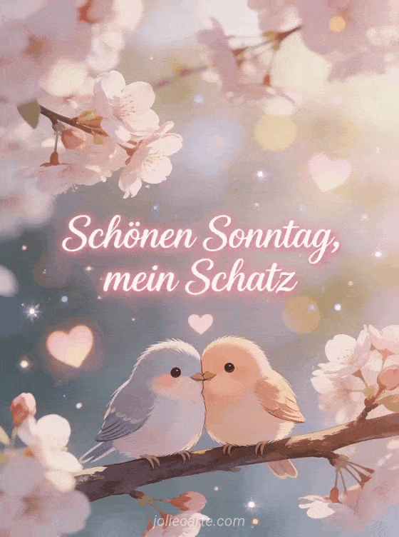 Teile einen romantischen Sonntagsgruß mit zwei süßen Unzertrennlichen auf einem Zweig, Kirschblüten und herzförmigem Licht. Du kannst auch schönen Sonntag animiert oder animierte Marienkäfer schönen Sonntag GIFs senden.