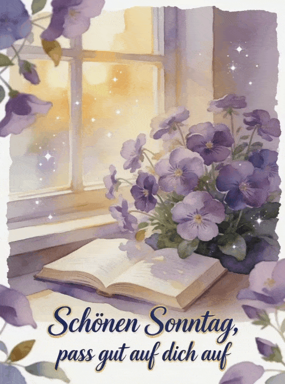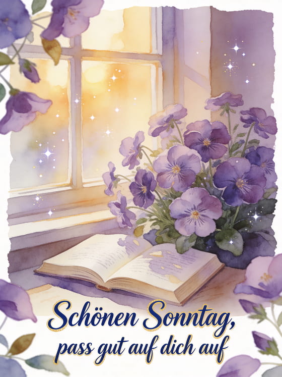 Sende schönen Sonntag, pass gut auf dich auf mit einer sanften Aquarell-Leseecke, einem offenen Buch nahe Veilchenblüten und warmem Fensterlicht. Du kannst auch ein Kaffee schönen Sonntag Freundschaft Bild, schöne animierte Bilder für schönen Sonntag oder schöne Schönen-Sonntag-Karten teilen.