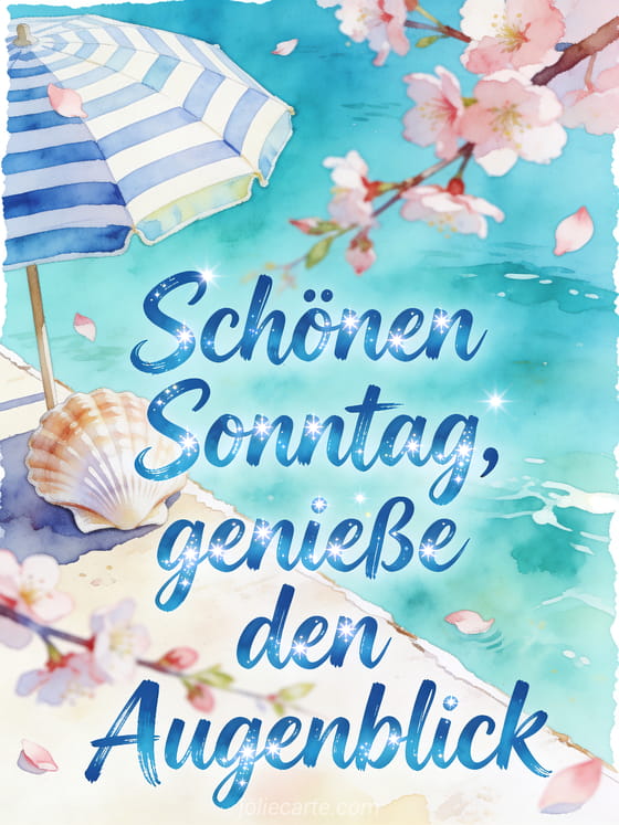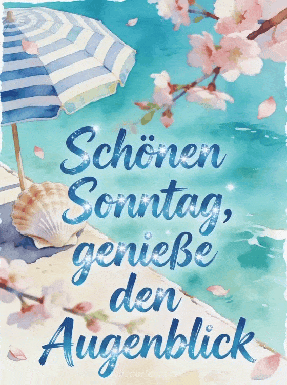 Sende einen fröhlichen schönen Sonntag Gruß mit einer Muschel, einem gestreiften Sonnenschirm, türkisfarbenem Wasser und Kirschblütenblättern im Küstenlicht. Entdecke auch Schönen Sonntag euch allen Bilder, schönen sonnigen Sonntag kostenlose Bilder oder ein bild schönen wintersonntag.