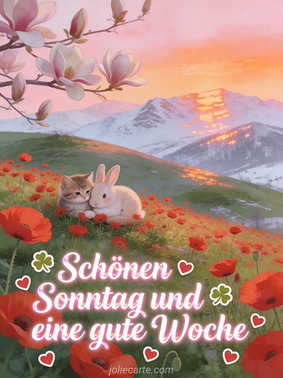 Senden Sie eine zärtliche Karte zum schönen Sonntag und eine gute Woche mit weißen kursiven Buchstaben, Kleeblättern, kleinen roten Herzen, roten Mohnblumen auf einem Hügel über einem grünen Tal, einem Kätzchen und einem Hasen zusammengekuschelt, Magnolienblüten und schneebedeckten Bergen bei Sonnenuntergang. Entdecken Sie auch erholsamer Sonntag Ruhe Bild, Schönen Sonntag Zitat oder Schönen Sonntag Freundschaft GIF.