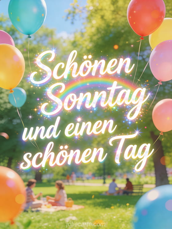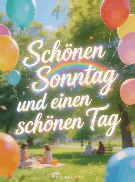 Teile einen hellen Gruß zum schönen Sonntag und schönen Tag mit optimistischer Schrift, Regenbogenfunkeln und bunten Ballons über einem sonnigen Park. Entdecke auch animierte Bilder zum schönen sonnigen Sonntag, eine Karte für erholsamen Sonntag oder ein Schönen-Sonntag-Küsse-GIF.