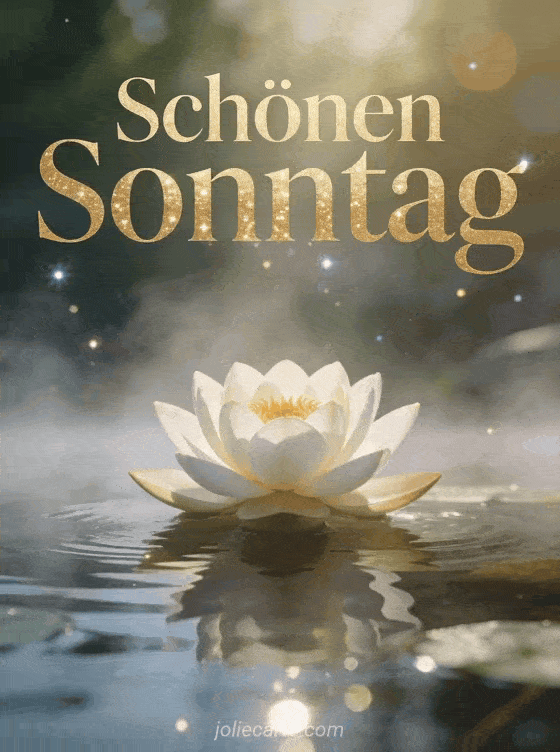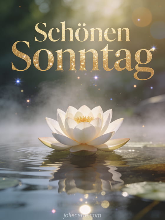 Teile ein Zitat zum schönen Sonntag mit inspirierender Schrift, subtilem Goldschimmer, einer schönen Lotusblume auf friedlichem Wasser, Morgennebel und spiritueller Zen-Garten-Stimmung. Entdecke auch Schönen Sonntag Freundschaft GIF oder schönen Sonntag Bilder animiertes GIF.
