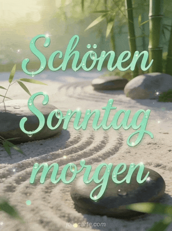 Senden Sie einen friedlichen Gruß zum schönen Sonntagmorgen mit frischer mintgrüner Schrift, Tautropfen-Effekten und einem gelassenen Zen-Garten mit glatten Steinen und Bambus. Entdecken Sie auch Schönen Sonntag mein Schatz, schönes Ende vom Sonntag oder schönen Tag Sonntag.
