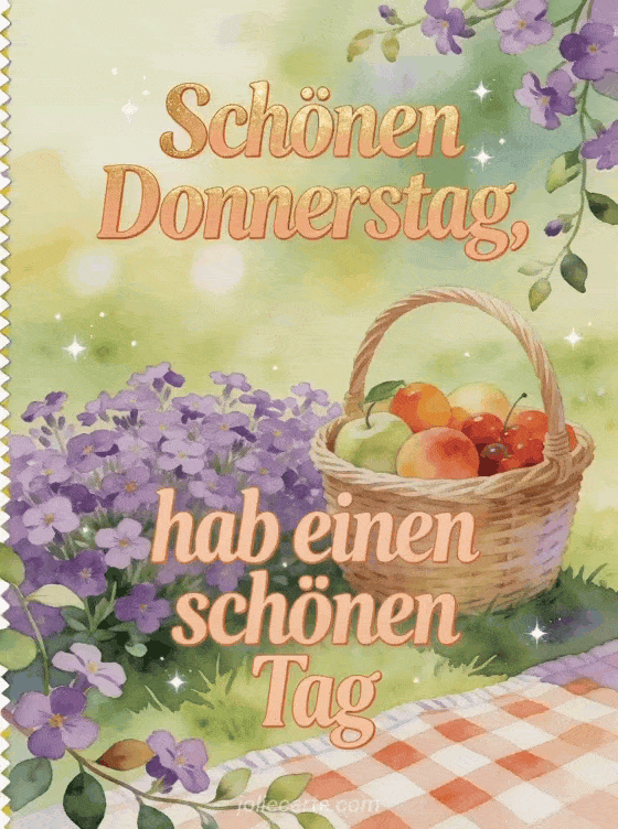 Teile einen schönen Tag am Donnerstag mit apricotfarbener Schrift, einem Picknickkorb voller leuchtendem Obst, violettem Blaukissen und kariertem Stoff. Entdecke auch ein Schönen Donnerstag Foto GIF, schönen Donnerstag Regen oder Guten Morgen schönen Donnerstag und schönen Tag.