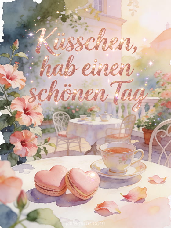Teile einen liebevollen Gruß für einen schönen Tag mit roségoldener Schrift, einem gemütlichen Teetisch in einem blühenden Hof, Hibiskusblüten, herzförmigen Macarons, losen Blütenblättern und sanft funkelndem Morgenlicht. Dazu passen auch ein schönen Tag Sonne GIF, ein schönen tag landschaft gif oder hab einen schönen Tag guten Morgen hab einen schönen Tag GIF.