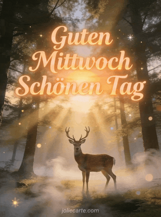 Teile einen herzlichen Mittwochsgruß mit dieser zauberhaften Karte mit einem majestätischen Hirsch im Wald. Entdecke auch Bilder Küsschen Mittwoch oder Guten Morgen guter Mittwoch Kaffee für mehr Inspiration zur Wochenmitte.
