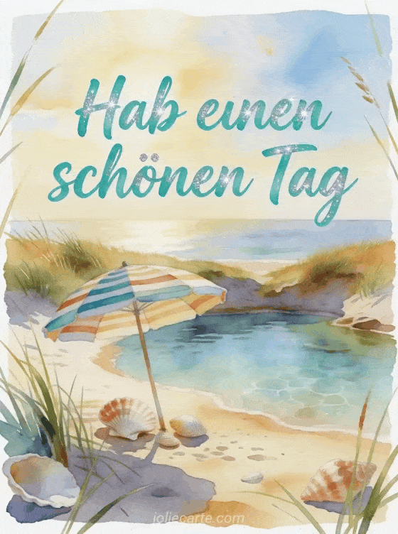 Sende einen entspannten Gruß für einen schönen Tag mit einer sonnigen Strandbucht, einem gestreiften Sonnenschirm, Muscheln und klarem Wasser. Entdecke auch Schönen Tag Sonne Gifs, Schönen sonnigen Tag GIFs oder schönen Tag Zen-GIF.