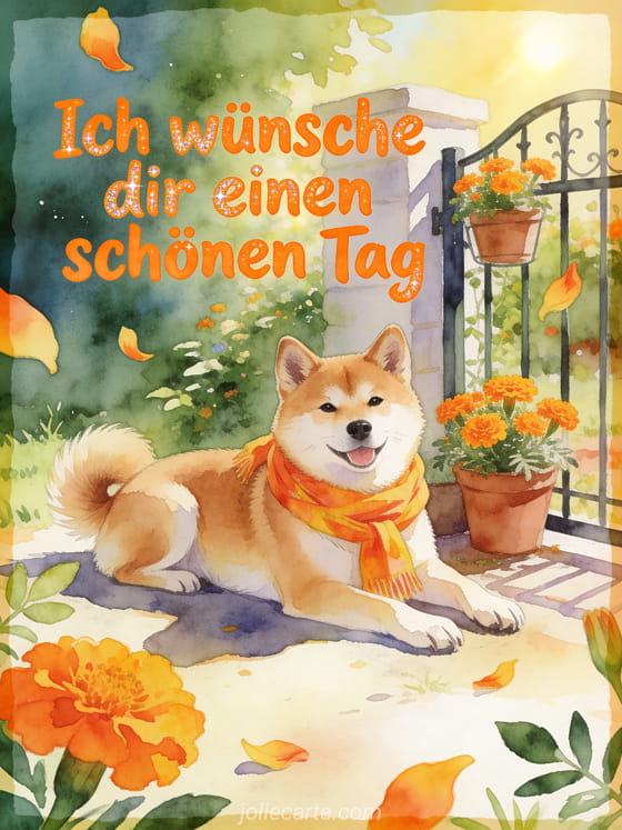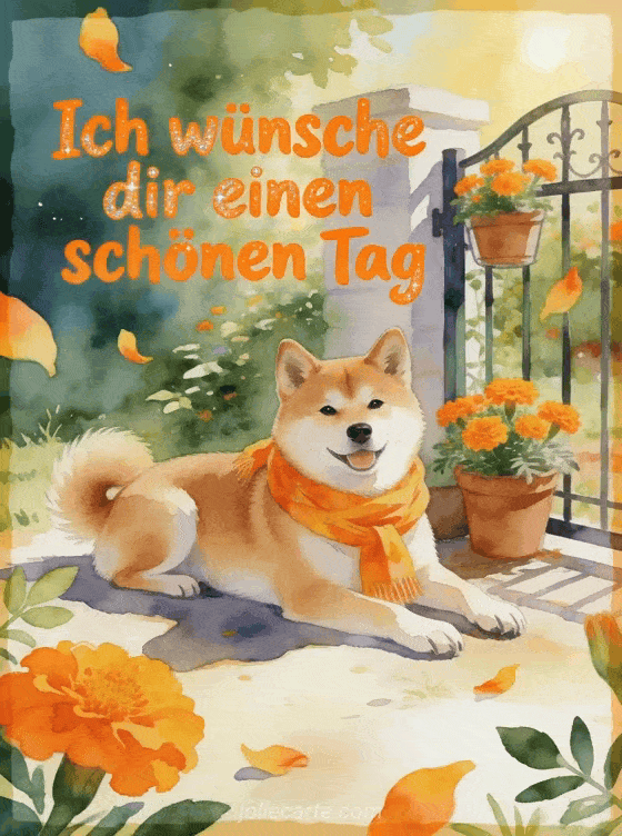 Erhelle jemandem den Tag mit einem Aquarell-Akita-Inu-Hund, der nahe einem Gartentor ruht, Ringelblumentöpfen, einem hellen Schal und sanfter Morgensonne. Entdecke auch Schönen Tag Herz GIFs, Schönen Tag Texte oder Elfen schönen Tag GIFs.