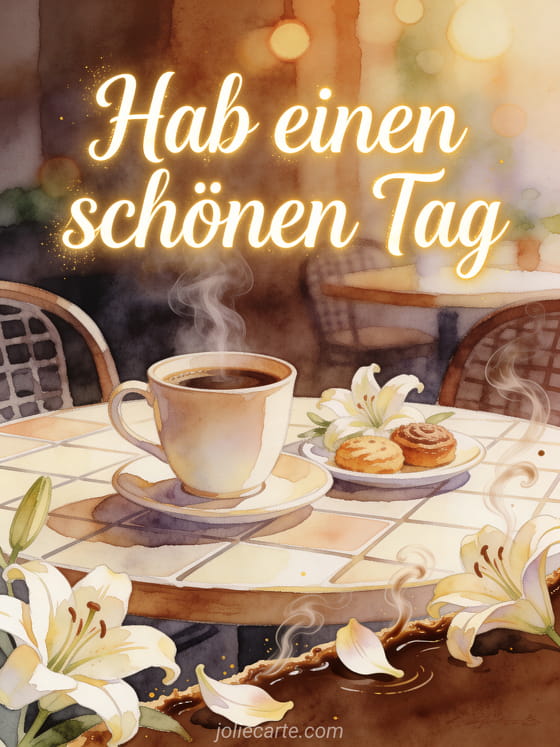 Teile einen gemütlichen Gruß für einen schönen Tag mit einer dampfenden Kaffeetasse, Gebäck und Taglilien auf einem Cafétisch. Entdecke auch ein Schönen Tag Schmetterling GIF, ein schönen Tag Katzen-GIF oder Schönen Tag GIFs.
