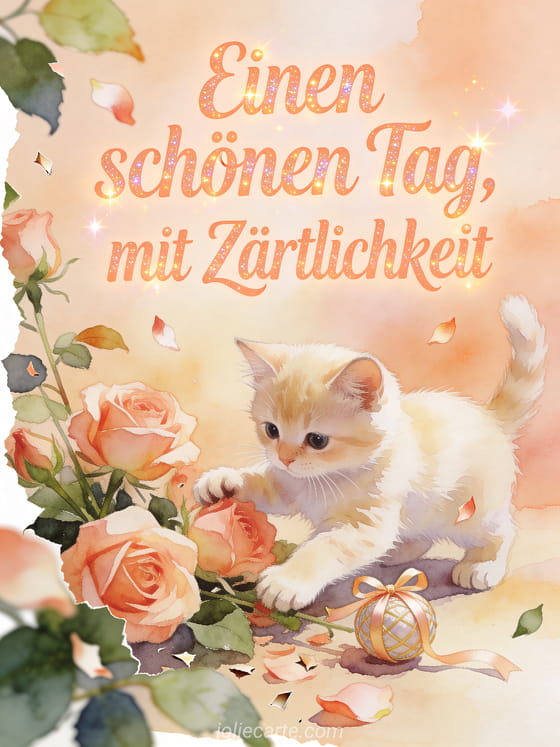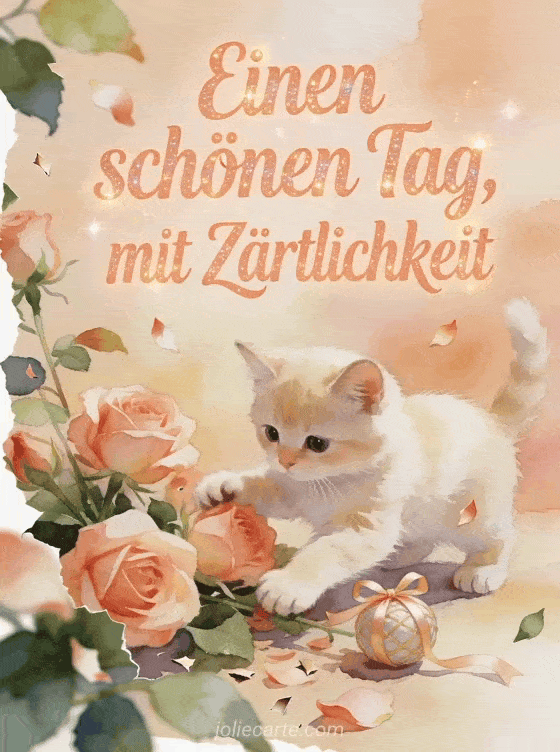 Teile einen schönen Tag mit Zärtlichkeit durch eine sanfte Aquarellszene, in der ein cremefarbenes Kätzchen neben Rosenblüten und einem kleinen Bandball spielt. Du kannst auch ein schönen Tag guten Morgen Strand Bild, Schönen Tag Sonne Gifs oder Schönen sonnigen Tag GIFs senden.
