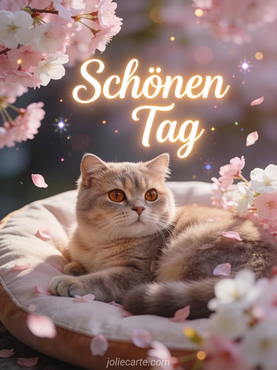 Sende diesen friedvollen Schönen-Tag-Wunsch mit einer flauschigen British Shorthair Katze mit großen Bernsteinaugen umgeben von rosa und weißen Kirschblüten. Entdecke auch eine Karte schönen Tag Zitat Bild oder eine Karte Küsse schönen Tag Kaffee Bild.