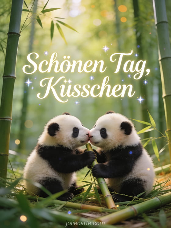 Verschönern Sie jemandem den Tag mit dieser zärtlichen Schönen-Tag-Karte mit entzückenden Pandababys, die mit Bambus spielen und sich ein süßes Küsschen geben. Entdecken Sie auch eine Schönen-Tag-Karte mit Sonnenschein oder eine Schönen-Tag-Karte mit Küsschen.