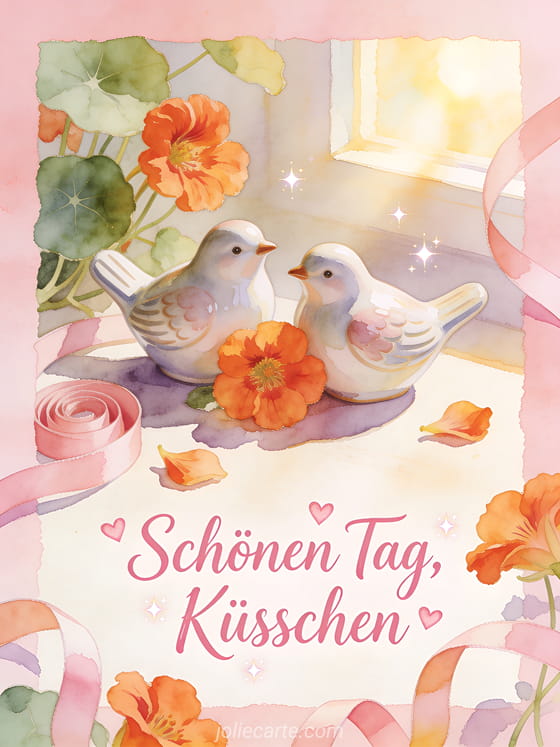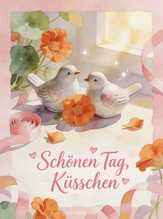 Teile ein süßes Aquarellstillleben mit zwei Keramikvögeln, Kapuzinerkresse, Schleifen, kleinen Herzfunken und warmem Morgenlicht. Dir gefallen vielleicht auch Schönen Tag Kaffee GIF, Schönen Tag Schmetterling GIF oder schönen Tag Katzen-GIF.