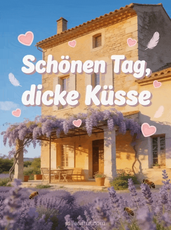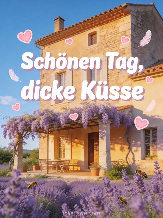 Erhellen Sie den Tag mit dieser charmanten Karte mit einem provenzalischen Steinhaus, Lavendelfeldern, Glyzinie und kleinen Bienen im warmen goldenen Licht. Entdecken Sie auch eine Guten-Morgen-Karte oder eine virtuelle Guten-Morgen-Karte.