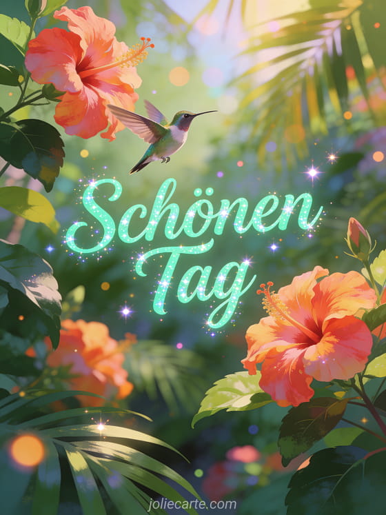 Teile schönen Tag Sonntag mit frischer mintgrüner Schrift, einem schönen Kolibri, der bei Hibiskusblüten schwebt, tropischen Gartenfarben und sommerlicher Energie. Entdecke auch Schönen Sonntag Bild oder Schönen Sonntag Karte.