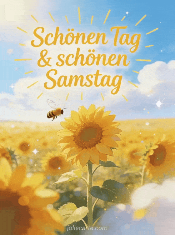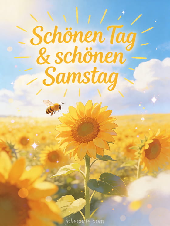 Senden Sie einen fröhlichen Samstagsgruß mit dieser strahlenden Karte mit einem Sonnenblumenfeld unter blauem Himmel und einer Biene in der Luft. Entdecken Sie auch kostenloses bild schönen samstag küsschen, schönen sonnigen samstag oder schönen samstag im regen.