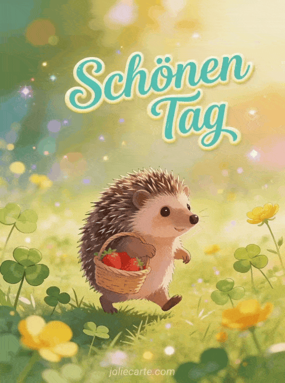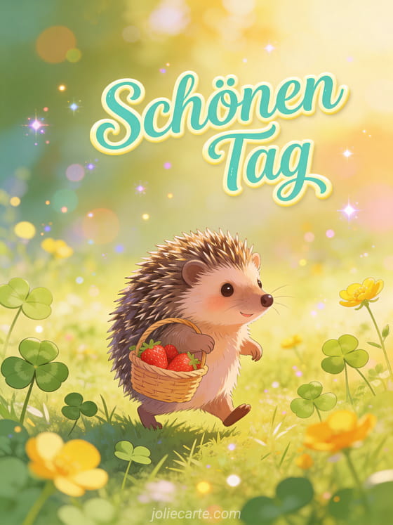 Verschönern Sie jemandem den Tag mit dieser entzückenden Karte. Ein süßer Igel trägt ein kleines Körbchen mit Erdbeeren durch eine sonnige Wiese mit Klee und Butterblumen im warmen Licht der goldenen Stunde. Entdecken Sie auch eine Karte für schönen Dienstag oder eine Grußkarte für schönen Dienstag.
