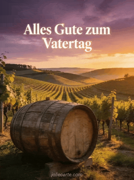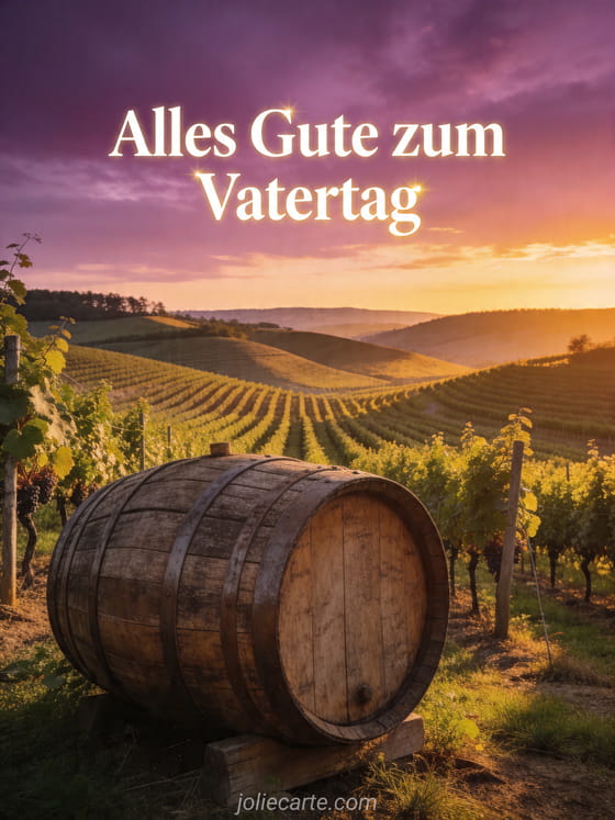 Teilen Sie schönen Vatertag mit einem fotorealistischen Weinberg bei Sonnenuntergang, Reihen von Reben auf sanften Hügeln, violett-goldenem Himmel und einem alten Holzfass im Vordergrund. Entdecken Sie auch ein Vatertag kurzes Zitat, eine Alles Gute zum Vatertag Papa Karte oder ein Alles Gute zum Vatertag GIF.