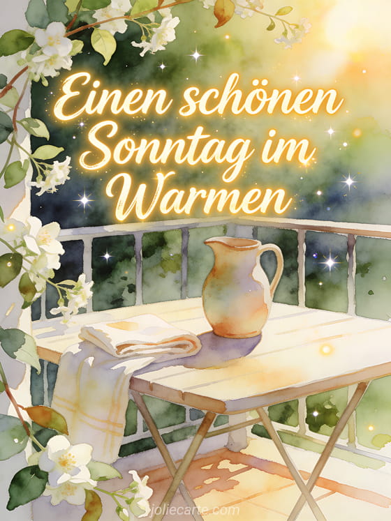 Sende ein schönes warmes Sonntag Bild mit honigfarbener Schrift, Jasmin und einer sonnigen Terrasse. Entdecke auch ein Schönen Sonntag Bild GIF, einen Schönen Sonntag Text oder ein Schönen Sonntag Hunde Bild.
