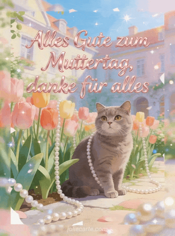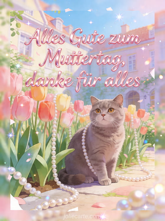 Teile einen schönen Alles Gute zum Muttertag Spruch für eine Mama mit rosiger handgeschriebener Schrift und einer Märchenillustration einer British Shorthair Katze zwischen hohen Tulpen und Perlengirlanden in einem fröhlichen Hof. Diese herzliche Karte sagt danke für alles. Entdecke auch Lyrik zum Muttertag, Mitteilungen zum Muttertag oder Bild zum Muttertag.