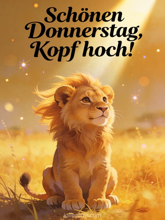 Teile einen kraftvollen Donnerstaggruß mit einem majestätischen Löwenjungen, das stolz im goldenen Savannen-Licht sitzt. Entdecke auch eine schöner Donnerstag Tag oder eine guter Donnerstag Zen Karte.