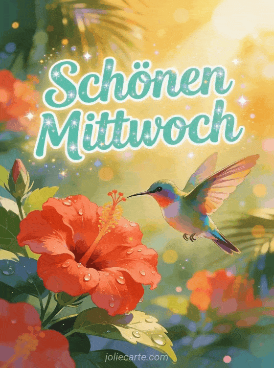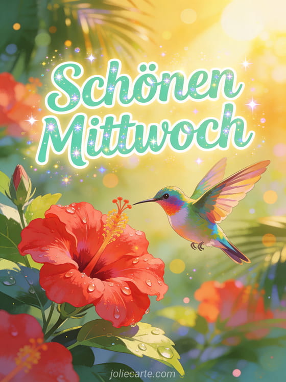 Teilen Sie dieses schöne Mittwochsbild mit einem bunten Kolibri, der neben roten Hibiskusblüten im goldenen Sonnenlicht schwebt. Eine lebhafte tropische Karte, perfekt um jemandem einen schönen Mittwoch zu wünschen. Entdecken Sie auch eine Karte guten morgen mittwoch oder eine Karte schonen mittwoch kusschen.