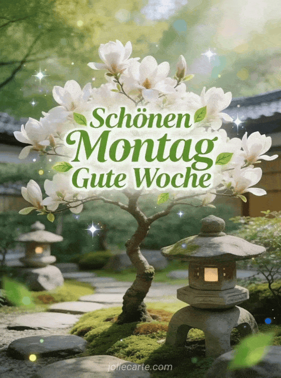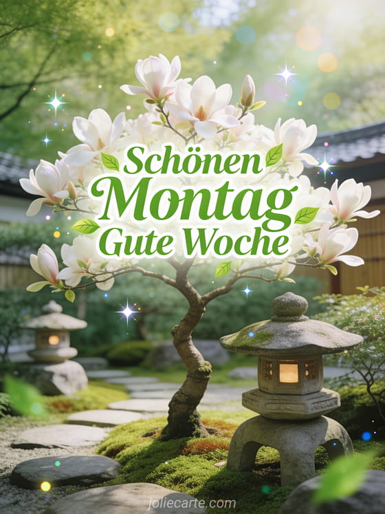 Starten Sie die Woche positiv mit dieser wunderschönen Karte, die einen blühenden Magnolienbaum im japanischen Garten zeigt und Erneuerung und Montagsenergie ausstrahlt. Entdecken Sie auch einen Kaffee schöner Montag gute Woche oder ein gute Woche guten Montag Bild.