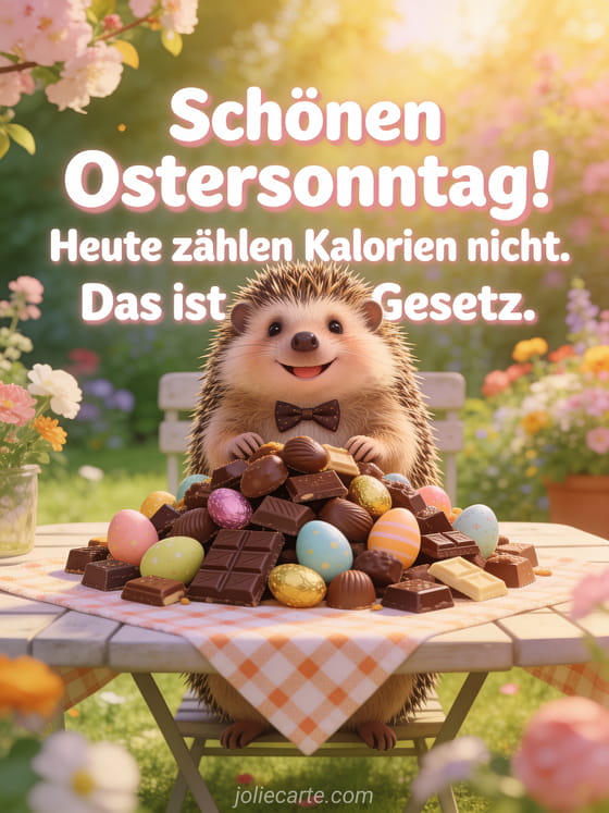 Teilen Sie ein Lachen am Ostersonntag mit dieser komischen Karte mit einem süßen Igel, der selig vor einem riesigen Berg aus Schokolade und Ostereiern sitzt. Entdecken Sie auch eine Ostersonntag-Karte, Ostermontag-Wünsche oder schönes Osterwochenende-Bild.