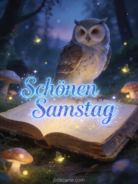 Teile mit dieser kostenlosen Karte einen magischen Gruß für einen schönen Samstag mit einem weisen Uhu auf einem alten Buch im Dämmerwald mit leuchtenden Pilzen. Entdecke auch schöner samstag bild lustig, schönen samstagabend oder schöner samstag freunde.