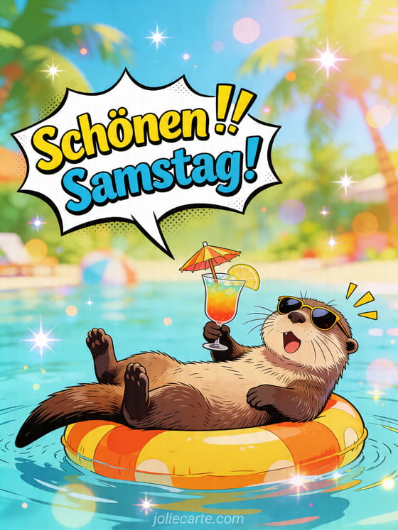 Sorge für gute Laune mit dieser Samstagskarte, auf der ein verrückter Otter auf dem Rücken treibt, eine winzige Sonnenbrille trägt und einen Cocktail in tropischer Atmosphäre hält. Entdecke auch schönen samstagabend, schöner samstag freunde oder witzig schönen samstag lustig.