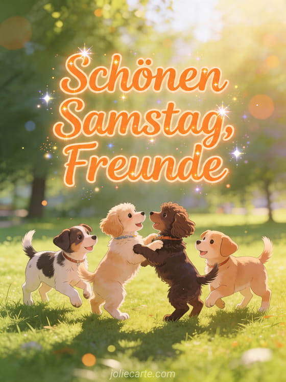 Teile mit dieser kostenlosen Karte einen fröhlichen Gruß für einen schönen Samstag für Freunde mit niedlichen Welpen, die zusammen in einem sonnigen Park spielen. Entdecke auch witzig schönen samstag lustig, lustiger schöner schöner samstag humor oder schönen samstag und schönes wochenende zitat.