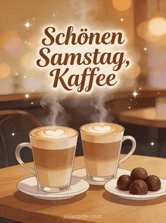 Teile mit dieser kostenlosen Karte einen warmen Gruß für einen schönen Samstag mit zwei Cappuccinos, Schokoladentrüffeln und romantischer Caféstimmung. Entdecke auch schönen samstag und schönes wochenende, gutes neues jahr 2017 bretonisch oder schöner samstag animiertes glitzerndes gif.