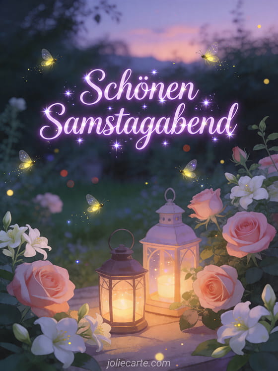 Teilen Sie diese zauberhafte Karte Schönen Samstagabend mit tanzenden Glühwürmchen, leuchtenden Laternen, Rosen und Jasmin in einem magischen Garten. Entdecken Sie auch schönen samstag gif, schönen sonnigen samstag und schönen samstag bilder.