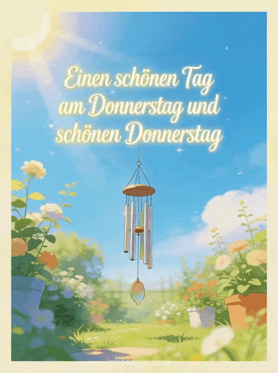 Teile einen schönen Tag am Donnerstag mit eleganter Leuchtschrift und einem Windspiel in einem Garten unter blauem Himmel. Dazu passen auch Schönen Donnerstag Küsse animierte GIFs, eine Schönen Donnerstag schöne Karte oder ein schönen Donnerstag GIF.
