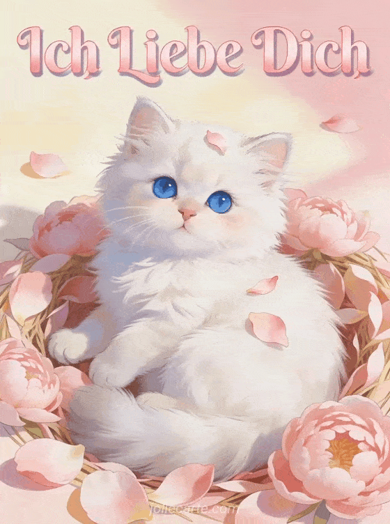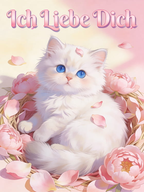 Drücke deine Liebe aus mit dieser entzückenden Ich Liebe Dich Karte mit einem weißen Perserkätzchen mit blauen Augen zwischen rosa Pfingstrosenblüten. Entdecke auch eine süße Liebeskarte oder eine animierte Liebeskarte.