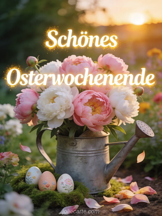 Wünschen Sie ein schönes Osterwochenende mit dieser romantischen Karte mit Pfingstrosen in einer Vintage-Gießkanne, handbemalten Ostereiern und goldenem Abendsonnenlicht. Entdecken Sie auch eine Osterwochenende-Karte, Osterwochenende-Grüße oder schönes Osterwochenende an alle.