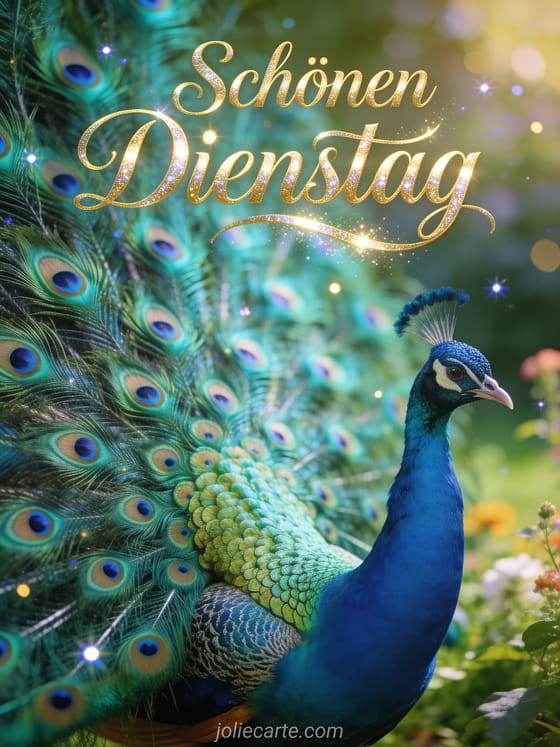 Verschönere jemandem den Dienstag mit dieser eleganten Karte mit einem majestätischen Pfau, der sein beeindruckendes schillerndes türkis-grünes Gefieder zeigt. Entdecke auch eine Karte lustiger schöner Dienstag, eine Karte schöner Dienstag Bild oder eine Karte Gif schönen Dienstag Küsschen.