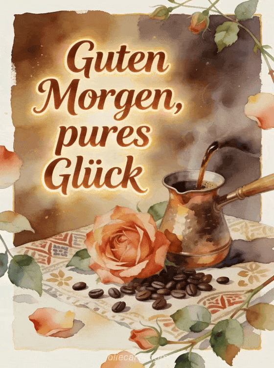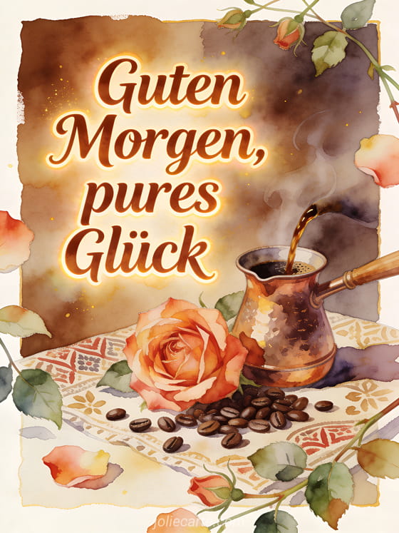 Teile einen reichen Morgenmoment mit dieser Aquarellkarte, mit einer Kupfer-Cezve, Kaffeeduft, einer vollen Rose und verstreuten Bohnen auf gemustertem Stoff. Entdecke auch Guten Morgen guter Kaffee, Guten Morgen Kaffee Küsschen GIF oder Guten Morgen Kaffee Herz GIF.