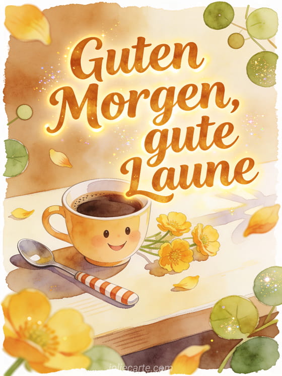 Starte den Tag mit einer Aquarell-Kaffeetasse, goldgelbem Hahnenfuß und einem gestreiften Löffel auf einer sonnigen Tischplatte. Dazu passen Guten Morgen guter Kaffee am Morgen, ein schönes Guten-Morgen-Kaffee-Bild oder Guten Morgen guter Kaffee.
