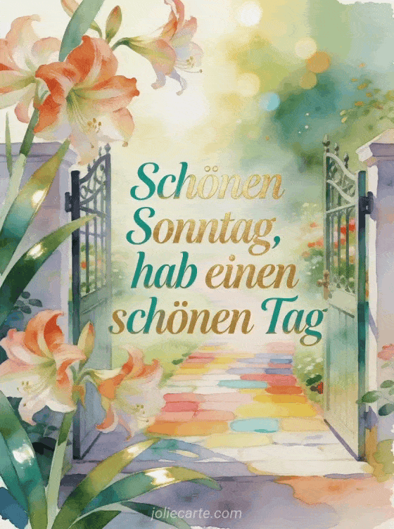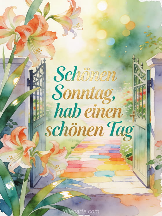 Wünsche einen schönen Sonntag mit einem offenen Gartentor, das zu einem bunten Weg führt, Amaryllisblüten und glänzenden Blättern in frischem Licht. Entdecke auch einen schöner Text schöner Sonntag, ein schönen Sonntag Herz GIF oder Guten Morgen Sonntag Bilder.