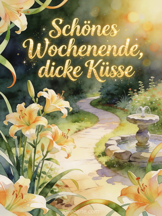 Teile einen liebevollen Wochenendmoment mit Taglilien in Aquarell, einem geschwungenen Gartenweg und einem kleinen Steinbrunnen im warmen Licht. Dazu passen schönes Wochenende und Küsse, Küsschen zum Wochenende oder ein schönes Wochenende Küsse Bild.