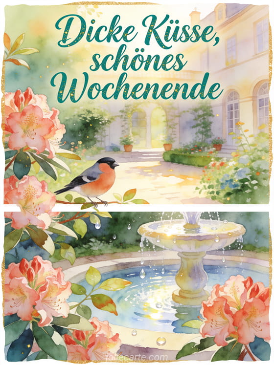 Sende dicke Küsse zum Wochenende mit einer Aquarellkarte, auf der Rhododendren, ein Gimpel und ein Gartenbrunnen eine zarte Hofszene bilden. Du kannst auch lustiges schönes wochenende humor teilen, ein schönes wochenende senden oder sonniges schönes wochenende humor wählen.