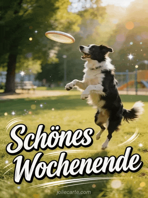 Schönes wochenende gif ein dynamisches animiertes Gif mit einem Border Collie der einen Frisbee fängt für ein schönes Wochenende