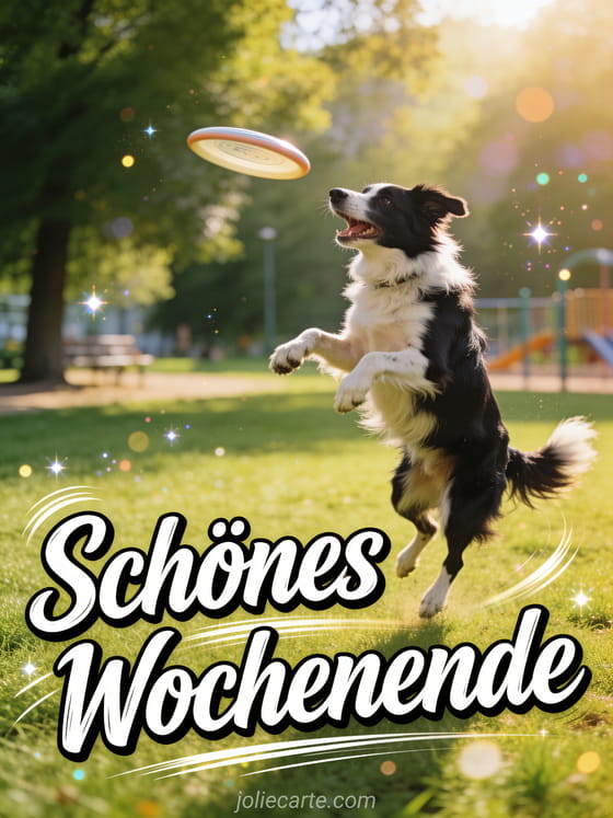 Sende ein schönes Wochenende-Gif voller Energie und Begeisterung. Ein aufgeregter Border Collie fängt einen Frisbee in der Luft — der perfekte sportliche Wochenendgruß. Entdecke auch ein Bilder von schönem wochenende oder eine Wochenendkarte.